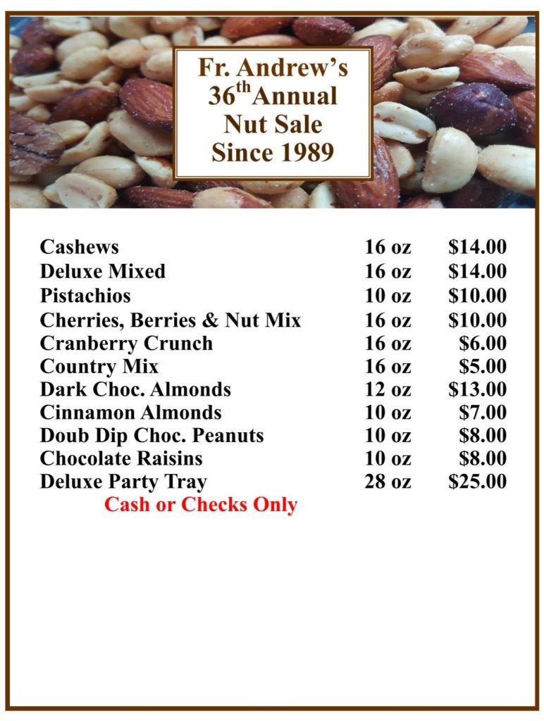 Nuts can be purchased during normal business hours at the Parish office. They will also be sold in the Family Center and after Masses while supplies last.